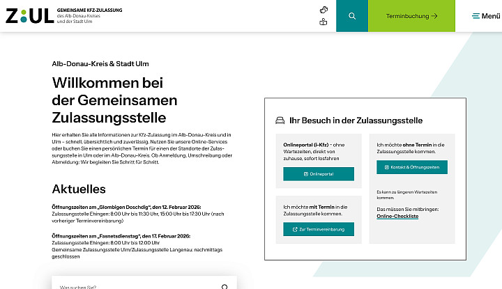 Die gemeinsame Zulassungsstelle der Stadt Ulm und des Alb-Donau-Kreises hat ihre Internetpräsenz neu gestaltet. Seit dem 21. Januar ist die überarbeitete Webseite unter www.zulassung-ulm.de online. Ziel des Relaunchs ist es, Bürgerinnen und Bürgern einen zeitgemäßen, übersichtlichen und serviceorientierten Zugang zu Informationen und Online-Angeboten rund um die Kfz-Zulassung zu bieten.