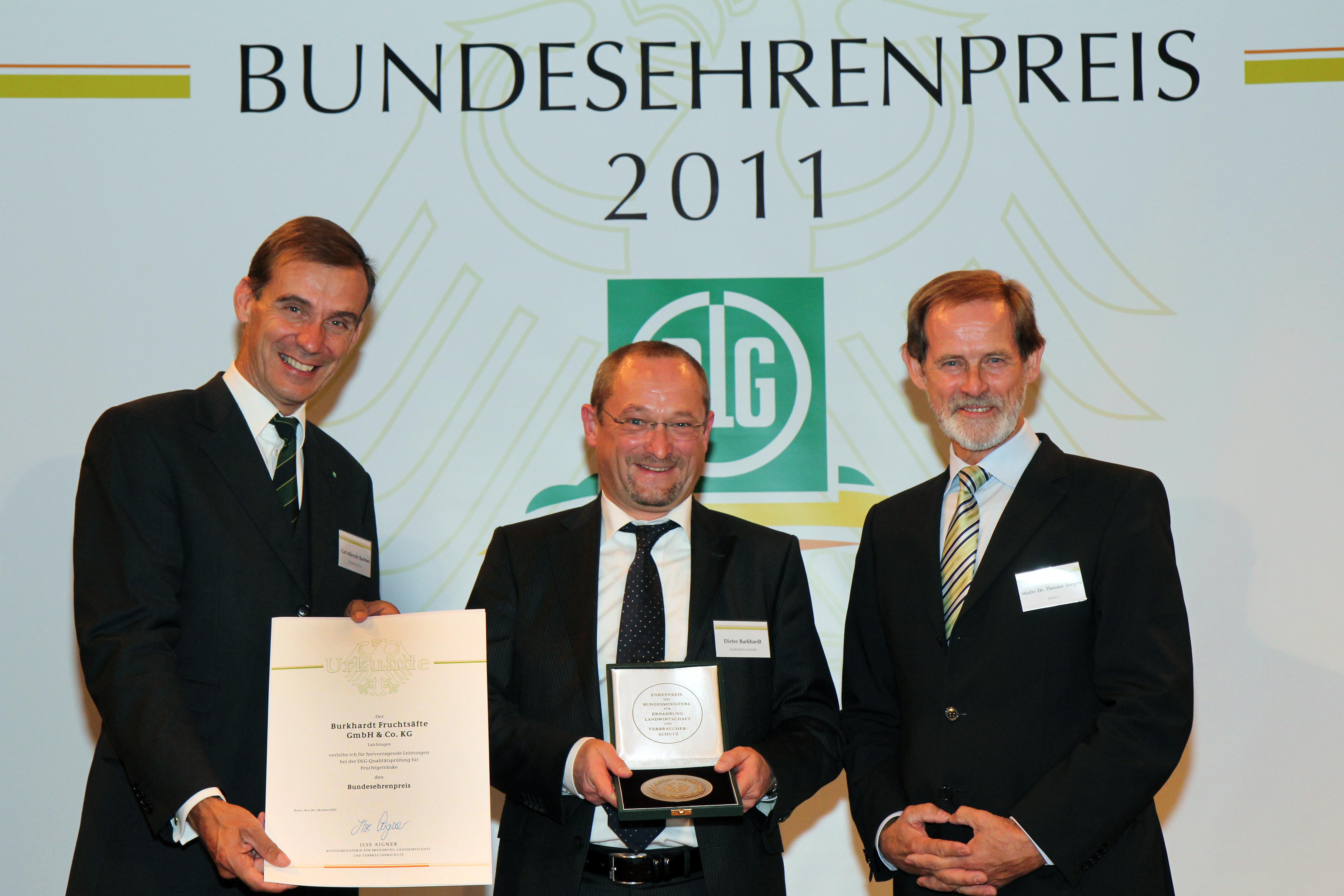 Die Burkhardt Fruchtsäfte GmbH & Co. KG aus Laichingen ist jetzt vom Bundesministerium für Ernährung, Landwirtschaft und Verbraucherschutz (BMELV) zum dritten Mal mit dem Bundesehrenpreis für Fruchtgetränke ausgezeichnet worden. Dies ist die höchste Ehrung, die ein Unternehmen der deutschen Ernährungswirtschaft für seine Qualitätsleistungen erhalten kann. „Der Bundesehrenpreis ist der Höhepunkt eines ausgezeichneten Jahres“, freute sich Firmenchef Dieter Burkhardt, dessen Unternehmen und Säfte in diesem Jahr mit fünf verschiedenen Preisen geehrt wurden.