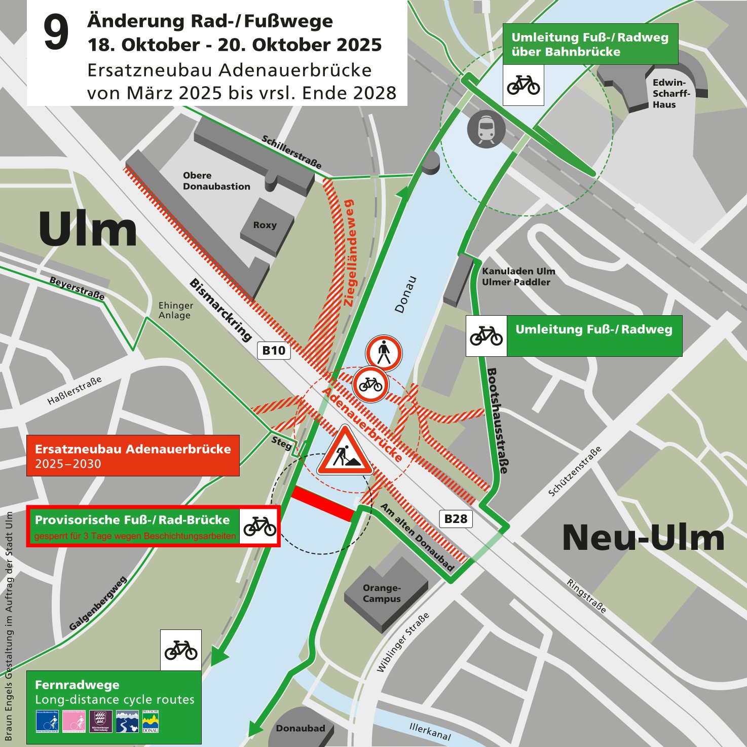 Für Beschichtungsarbeiten an der provisorischen Geh- und Radwegbrücke muss diese von Samstag, den 18.10.2025, bis einschließlich Montag, den 20.10.2025, gesperrt werden. Die Umleitung des Geh- und Radverkehrs erfolgt stromabwärts über den Geh- und Radweg im Zuge der Eisenbahnbrücke Ulm - Neu-Ulm.
