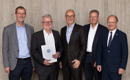 BMS_Preis_Gruppe: Internationaler Dr. Barbara Mez-Starck-Preis 2025: Laudator Prof. Axel Groß, Preisträger Prof. Maximilian Fichtner, Werner Braun und Thomas Vetter, Stiftungsvorstände und Universitätspräsident Prof. Michael Weber (v.l.)