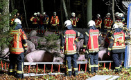 Der Lkw-Fahrer konnte sich zwischenzeitlich selbst aus seinem Fahrzeug befreien und blieb unverletzt. Die Schweine im Laderaum wurden durch die Feuerwehr befreit und in einem provisorischen Gatter aus Steckleiterteilen auf dem Waldboden betreut. Dort fanden sie im Laub zahlreiche Eicheln und beruhigten sich schnell. Da mehrere Feuerwehrleute selbst hauptberuflich Landwirte sind, konnte sie durch ihre Erfahrung den Tiere helfen, den Stress des Unfalls abzubauen. Ein Veterinär kam an die Unfallstelle, um die Tiere auf Verletzungen zu untersuchen.