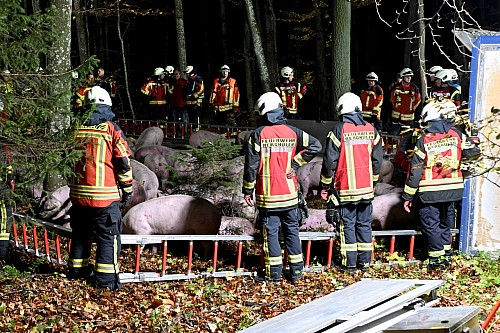 Der Lkw-Fahrer konnte sich zwischenzeitlich selbst aus seinem Fahrzeug befreien und blieb unverletzt. Die Schweine im Laderaum wurden durch die Feuerwehr befreit und in einem provisorischen Gatter aus Steckleiterteilen auf dem Waldboden betreut. Dort fanden sie im Laub zahlreiche Eicheln und beruhigten sich schnell. Da mehrere Feuerwehrleute selbst hauptberuflich Landwirte sind, konnte sie durch ihre Erfahrung den Tiere helfen, den Stress des Unfalls abzubauen. Ein Veterinär kam an die Unfallstelle, um die Tiere auf Verletzungen zu untersuchen.