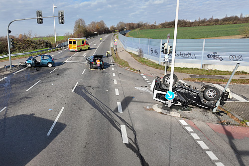 Abschleppwagen mussten den Jeep und den Nissan bergen, den Sachschaden schätzt die Polizei auf rund 60.000 Euro. Die Ampelanlage an der Kreuzung muss mit einem neuen Mast versehen werden, solange bleibt die Anlage außer Betrieb.