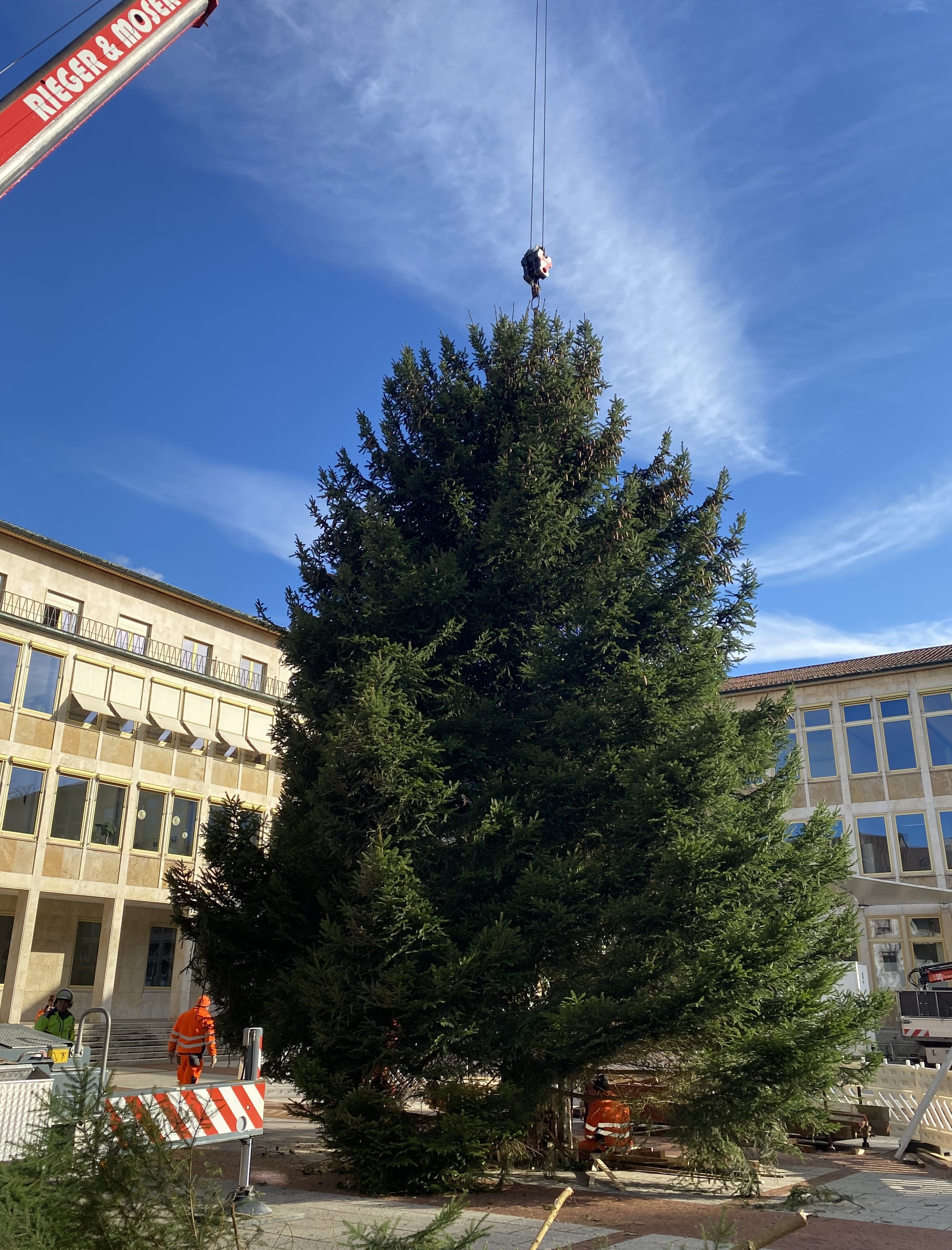 Weihnachtsbaum auf dem Rathausplatz aufgestellt. Die 45