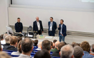 Foto 1: Prof. Dr. Jens Kolb, Martin Bendel und Prof. Dr. Philipp Brune begrüßten die Gäste im Hörsaal der HNU.