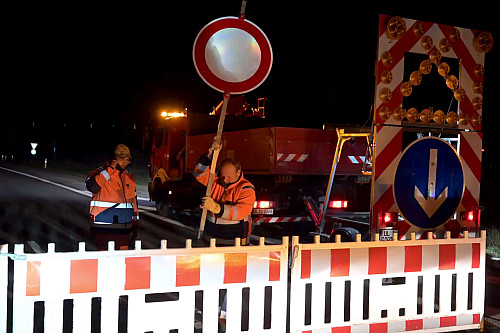 Pünktlich um 21 Uhr gestern Abend (Freitag, 28. Nov 2025) rollte der Sicherungsanhänger des städtischen Baubetriebshofs an. Vorbereitete Warnbaken wurden positioniert, gelbe Fahrbahnmarkierungen angebracht.