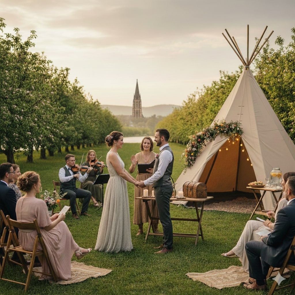 - Wetter-Planung mit Stil: Wer in der Natur feiert, braucht einen Plan B, aber der muss zur Atmosphäre passen. Ein rustikales Tipi oder eine liebevoll hergerichtete, offene Scheune im Ulmer Umland sind nicht nur Notlösungen, sondern fügen sich perfekt in den lässig-eleganten Stil ein und bieten Schutz, ohne das Freiheitsgefühl zu nehmen.