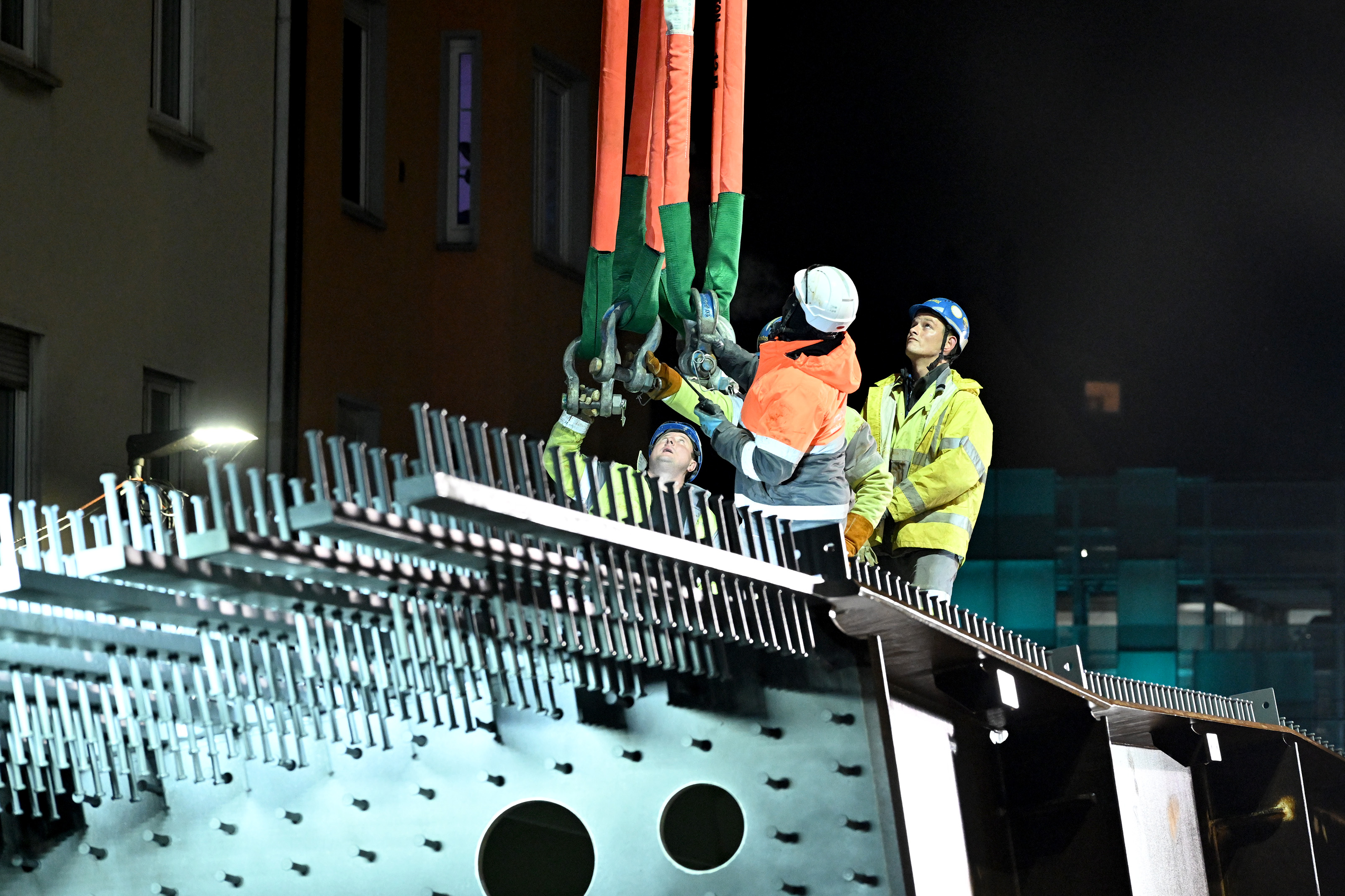Der Verkehr über die Gänstorbrücke musste dafür gesperrt werden, auch das halbe Dutzend Zuschauer musste etwas zurückweichen, um nicht unter der schwebenden Last zu stehen und sich möglicherweise in Gefahr zu bringen. Routiniert wurde die Brücke an den vorgesehenen Platz bewegt. In den vergangenen Wochen wurde dort ein Hilfsgerüst aufgebaut, an dem Hydraulikstempel das angelieferte Stahlbauteil millimetergenau positionieren können. Das Brückenteil sieht oben und an der Stirnseite aus wie ein Igel, unzählige Bolzen ragen aus der Fläche heraus. Timo Roth erklärt, dass diese einerseits zur Verzahnung mit dem Widerlager am Neu-Ulmer Ufer diesen und nach oben hin eine feste Verbindung mit der Fahrbahn entsteht. Kaum, dass der Kran das Brückenteil abgesetzt hat, sprühen auch schon die Funken und Schweißer schaffen die ersten festen Verbindungen mit den passend gebogenen Stählen am Neu-Ulmer Ufer. Auch in den Nächten auf Donnerstag und Freitag werden Brückenteile angeliefert, in der kommenden Woche in den Nächten auf Dienstag und Donnerstag. Auch Mitte Dezember gibt es zwei weitere Nächte Sperrungen, in denen teilweise auch zwei Brückenteile angeliefert werden.