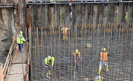 Die Mitte der Donau wird so noch dieses Jahr erreicht. Im Morgengrauen geht es auch auf Ulmer Seite mit einem großen Schritt weiter. Ein großes Teil des Widerlagers, also der Brückenbefestigung am Ufer wird betoniert. Arbeiter haben in den letzten Wochen nicht nur den Baugrund mit Bohrpfählen stabilisiert, sondern darauf auch ein Eisengeflecht angebracht. Dieses wurde am Mittwoch zwei Meter hoch mit Beton gefüllt. 500 Kubikmeter Beton wurden dazu in Illertissen angemischt, in rund 70 Fahrten brachten 17 Betonmischer im Pendelverkehr den Baustoff nach Ulm. Im Acht-Minuten-Takt wurde angeliefert, damit die Betonpumpe mit ihrem langen Arm immer versorgt wird und der Beton über rund 50 Meter Entfernung direkt zwischen die Eisenarmierungen gepumpt werden konnte. Schicht für Schicht wurde der Beton aufgetragen und mit fünf Flaschenrüttlern sofort verdichtet.
