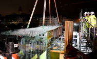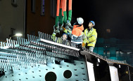 Doch vorher muss noch die Zufahrt bewältigt werden. Die favorisierte Variante, den Schwertransporter rückwärts in die Baustelle fahren zu lassen, funktioniert nicht, obwohl extra eine mobile Ampel mit einem Radlader weggehoben wird. Die Radien der verschiedenen Fahrbahnen auf dem Augsburger-Tor-Platz reichen dafür nicht aus. Vorwärts klappt es dann und die Arbeiter können gegen 23 Uhr die Brücke anheben.
