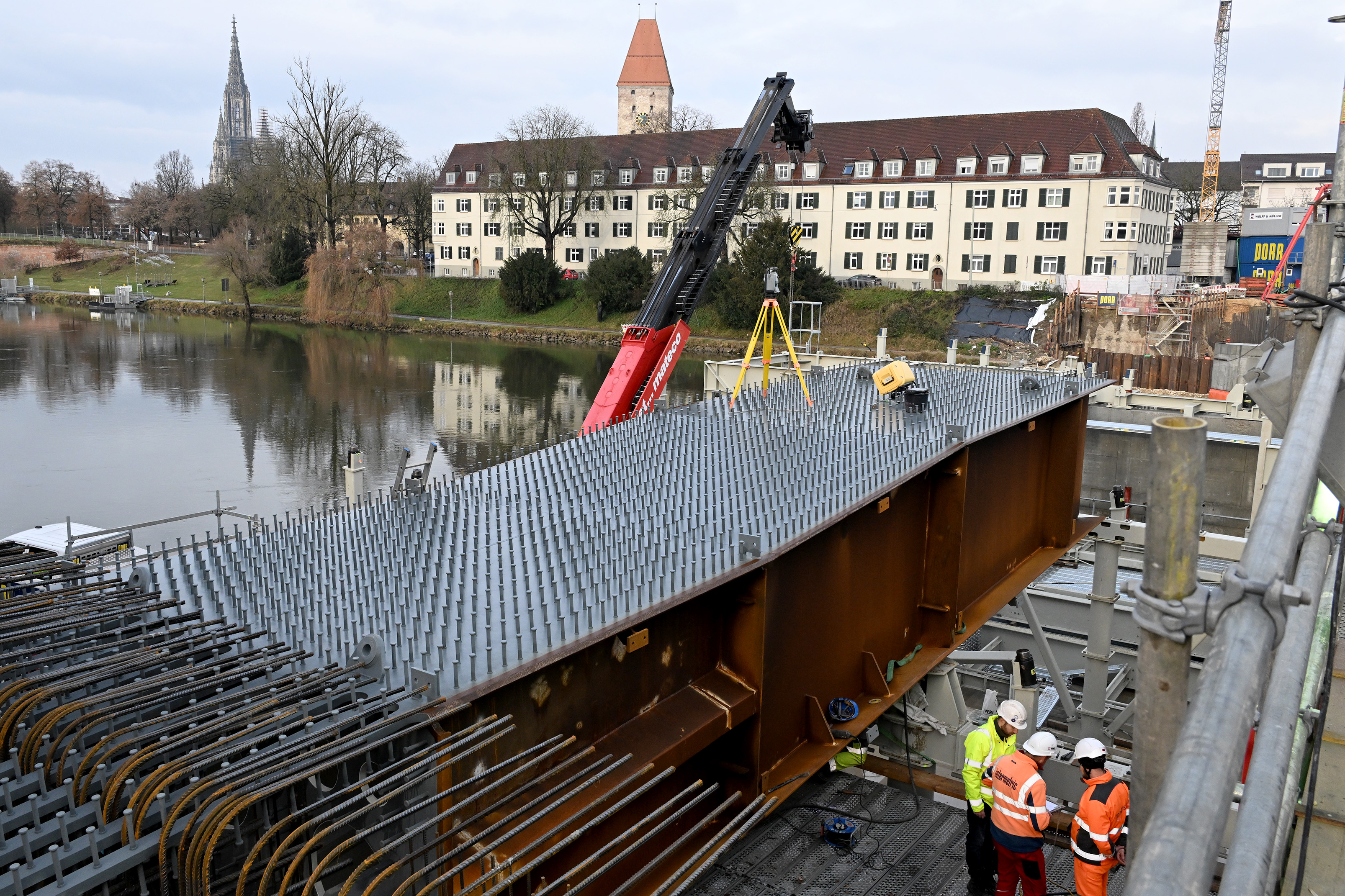 Der Verkehr über die Gänstorbrücke musste dafür gesperrt werden, auch das halbe Dutzend Zuschauer musste etwas zurückweichen, um nicht unter der schwebenden Last zu stehen und sich möglicherweise in Gefahr zu bringen. Routiniert wurde die Brücke an den vorgesehenen Platz bewegt. In den vergangenen Wochen wurde dort ein Hilfsgerüst aufgebaut, an dem Hydraulikstempel das angelieferte Stahlbauteil millimetergenau positionieren können. Das Brückenteil sieht oben und an der Stirnseite aus wie ein Igel, unzählige Bolzen ragen aus der Fläche heraus. Timo Roth erklärt, dass diese einerseits zur Verzahnung mit dem Widerlager am Neu-Ulmer Ufer diesen und nach oben hin eine feste Verbindung mit der Fahrbahn entsteht. Kaum, dass der Kran das Brückenteil abgesetzt hat, sprühen auch schon die Funken und Schweißer schaffen die ersten festen Verbindungen mit den passend gebogenen Stählen am Neu-Ulmer Ufer. Auch in den Nächten auf Donnerstag und Freitag werden Brückenteile angeliefert, in der kommenden Woche in den Nächten auf Dienstag und Donnerstag. Auch Mitte Dezember gibt es zwei weitere Nächte Sperrungen, in denen teilweise auch zwei Brückenteile angeliefert werden.