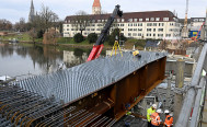 Erstes Teil der Gänstorbrücke schwebt ein Das erste Stahlteil der neuen Gänstorbrücke ist in der Nacht zu Mittwoch mit einem Mobilkran eingehoben worden. Projektleiter Timo Roth von der Stadt Ulm freut sich: "Ich bin ganz happy, hab fast schon ein bisschen Pippi in den Augen.“ Damit sind die Bauarbeiten an der Donaubrücke zwischen Ulm und Neu-Ulm nahezu im Zeitplan. In einem polnischen Werk werden derzeit die Bauteile für den westlichen Teil der neue Brücke gefertigt. Das erste Teil ist gut 62 Tonnen schwer und kommt mit einem Schwertransporter von der Autobahn 7 nach Neu-Ulm. In der Brückenstraße ist ein riesiger Mobilkran aufgebaut, an dem schon die Seile baumeln, mit dem das Brückenteil angehoben werden soll.