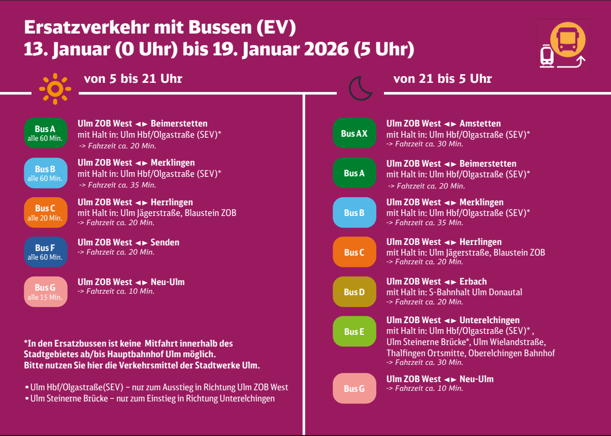 DING setzt acht Busse zusätzlich ein wegen teilweiser Sperrung des Ulmer Hauptbahnhof ab Mitte Januar