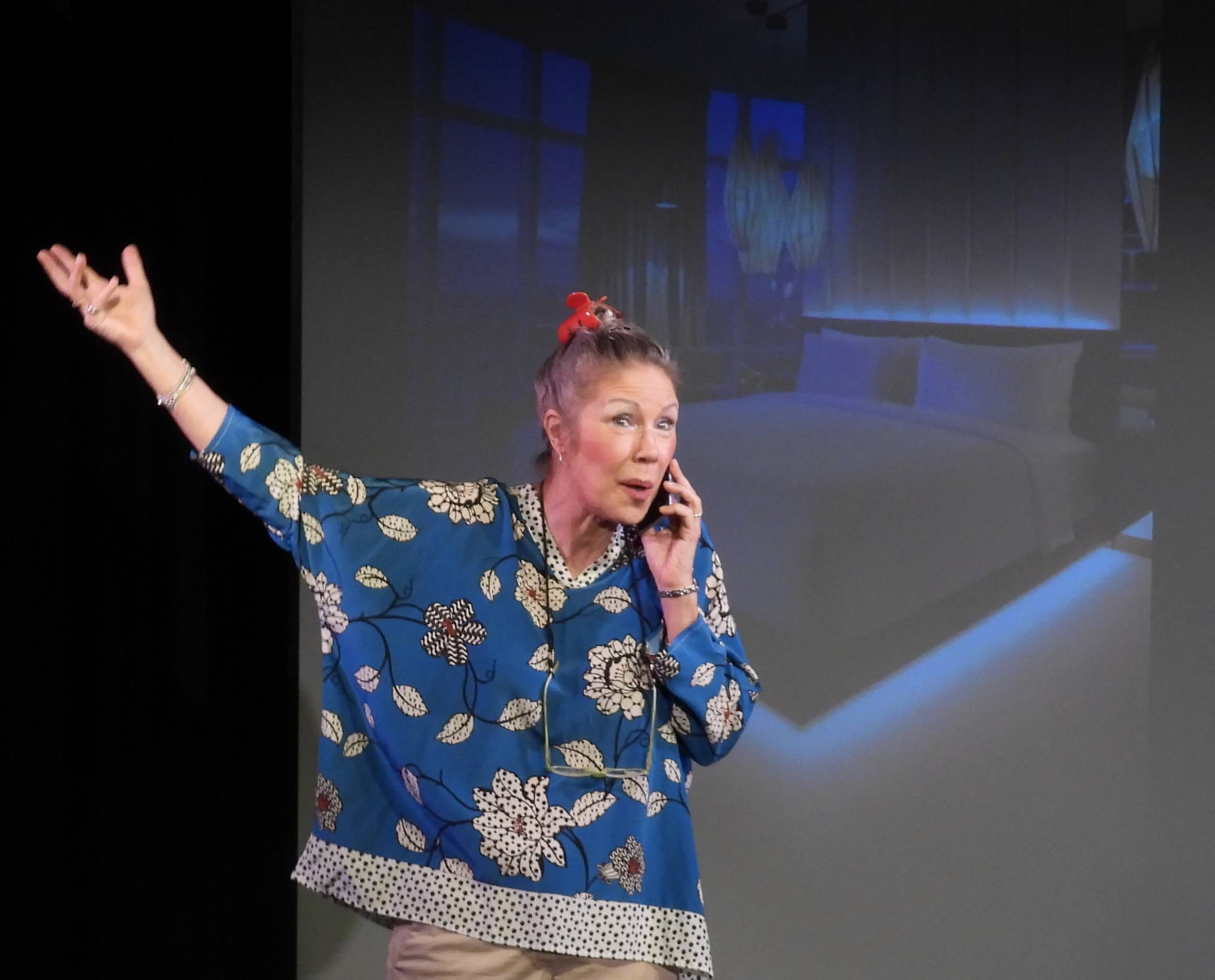 Beschreibung: Theaterleiterin Claudia Riese (hier in der Rolle "Lore" in "Alte Liebe"), die nahezu 50 Jahre mit dem Jubilar künstlerisch zusammenarbeitet, lädt alle, die Lust haben mitzufeiern, ein zum event "Standpauke und Ständ