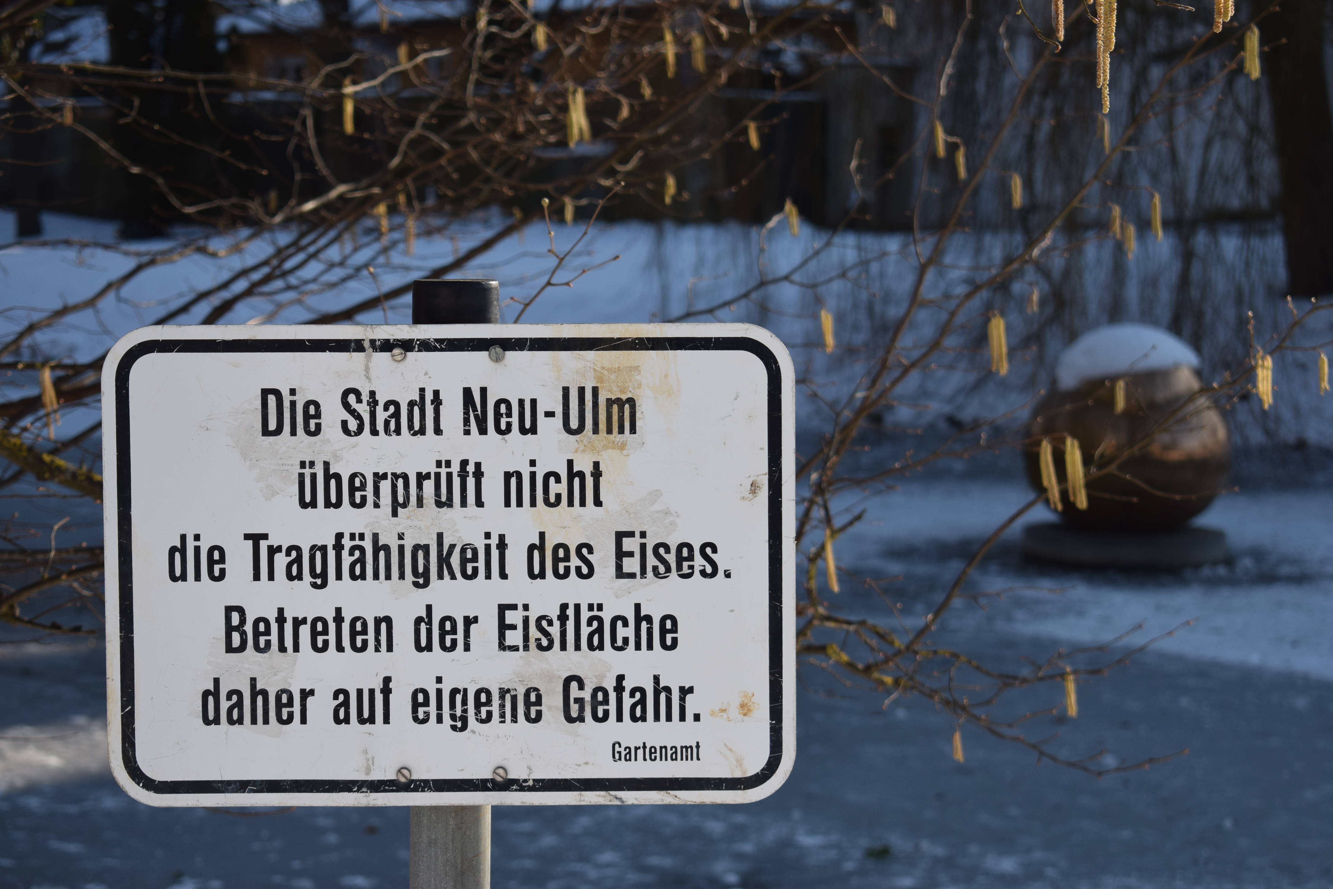 Die Stadt Ulm warnt eindringlich davor, gefrorene Gewässer wie die Auseen in der Friedrichsau zu betreten. Die Eisflächen sind dafür nicht freigegeben. Ein Betreten erfolgt auf eigene Gefahr.