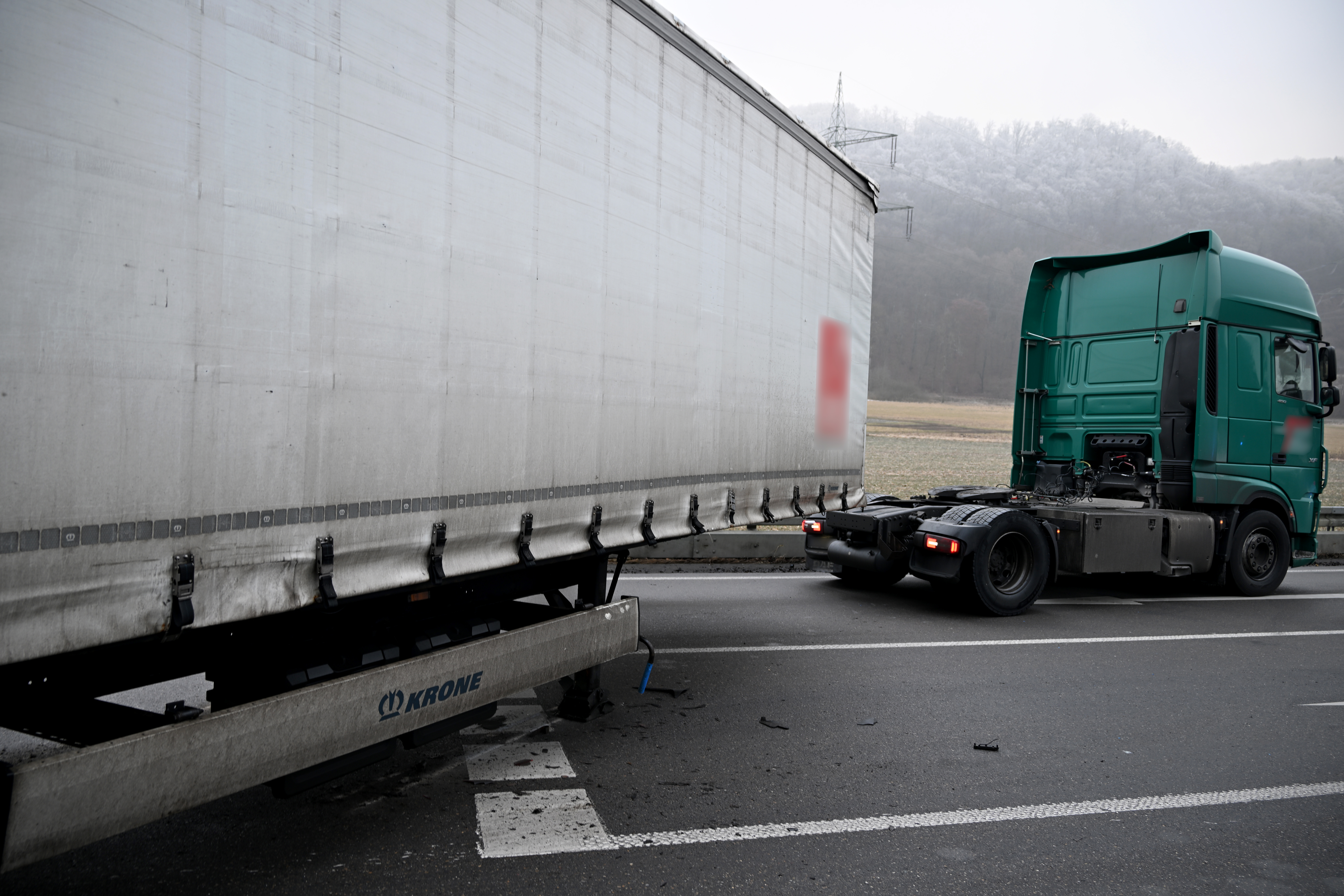 Der Sattelauflieger stand quer über der gesamten Fahrbahn, die Stützen rissen Kratzer in den Asphalt. Eine Weiterfahrt war unmöglich. Auch ein erneutes Ankuppeln scheiterte zunächst. Die Front des Aufliegers stand zu tief.