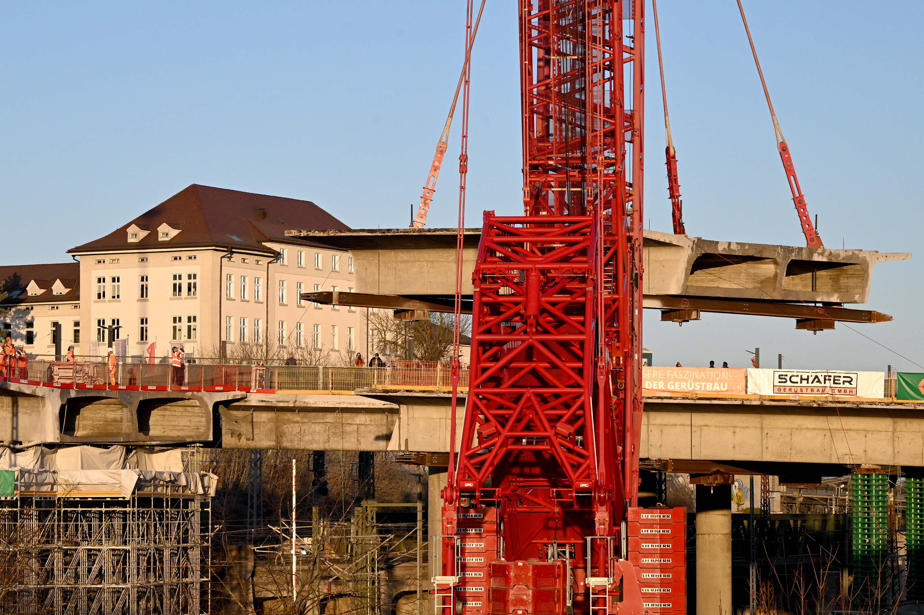 Der Aufbau ist in vollem Gange und liegt absolut im Zeitplan. Am Freitag, 27.02., morgens ab 7.30 Uhr beginnen die Sägearbeiten und um die Mittagzeit erfolgt dann der Aushub des ersten Brückenteils. Dies wird eine Fläche von ca. 400 qm, eine Länge von ca. 21 m und ein Gewicht von ca. 380 Tonnen haben. Der Raupenkran wird rund um die Uhr im Einsatz sein und insgesamt 32 Teile ausheben. Er wird zunächst mit einem 86 m hohen Ausleger arbeiten. Vsl. ab Dienstagnacht (03.03.) wird der Ausleger auf eine Höhe von 126 m erweitert.