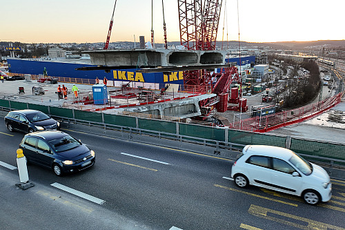 So vermied der Kranführer geschickt gefährliche Schwingungen des 380 Tonnen schweren Elements. Präzisionsarbeit und straffer Zeitplan Nach einer guten halben Stunde war das riesige Brückenteil sicher am Boden. Der erfahrene Kranführer hatte nur wenige Zentimeter Spielraum bei seiner Arbeit. Er navigierte das gewaltige Element äußerst präzise aus der entstandenen Lücke. Während des Schwebens bot sich den Menschen ein seltener und faszinierender Anblick. Die Zuschauer konnten in den offenen Hohlkasten der Brücke blicken. Der innere Aufbau der alten Spannbetonbrücke wurde so für alle sichtbar. Am Boden warteten bereits zwei große Bagger auf ihren Einsatz. Sie zerlegten den Betonkasten sofort mit ihren starken Betonscheren. Mehrere Lastwagen transportierten die Brocken auf das nahegelegene Moto-Areal. Dort steht eine Recyclinganlage für den anfallenden Bauschutt bereit. Wertvoller Stahl wird dabei vom Beton getrennt und anschließend wiederverwertet. Aus den großen Betonbrocken werden kieselsteingroße Stücke gemacht. Über 98 Prozent des Materials sollen auf diese Weise wiederverwendet werden.