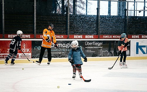 Darüber hinaus freuten sich die Besucher des öffentlichen Publikumslaufes über zwei weitere Ereignisse: beim Schlägerlauf konnten Hobby-Läufer mit Helm, Schläger und Puck aufs Eis - eine Alternative zum Wettkampfsport der Vereine – für alle Altersgruppen. So kam zum Beispiel auch ein 70-jähriger Senior mit Helm und Handschuhen aus seiner Jugendzeit auf die Eisfläche – zusammen mit seinem Enkel!