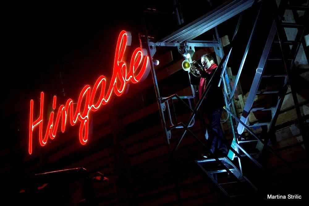 Am Mittwochabend wurde eine Baugrube zum Hör- und Schauplatz eines spirituellen Erlebnisses: Der klare, sphärische Ton des Flügelhorns von Joo Kraus erklang auf der Baustelle der neuen Ulmer Synagoge am Weinhof, überstrahlt von einer Neonlicht-Installation mit dem Schriftzug "Hingabe" in leuchtendem Rot. Die Inszenierung fand im Rahmen der Reihe "Zyklus“ statt, mit der die Schauspielerin und Regisseurin Susanne Maier mit ihrem Ensemble monatlich visuelle und akustische Bildinszenierungen an öffentlichen Plätzen bietet.
