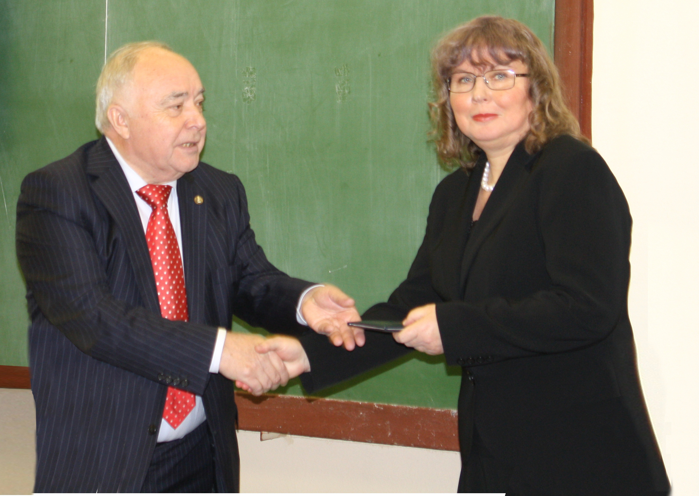 Beschreibung: Prof. Valerii Lunin, Dekan der Chemischen Fakultät der Lomonossov-Universität Moskau, überreicht Dr. Natalja Vogt die Habiltitationsurkunde