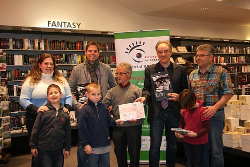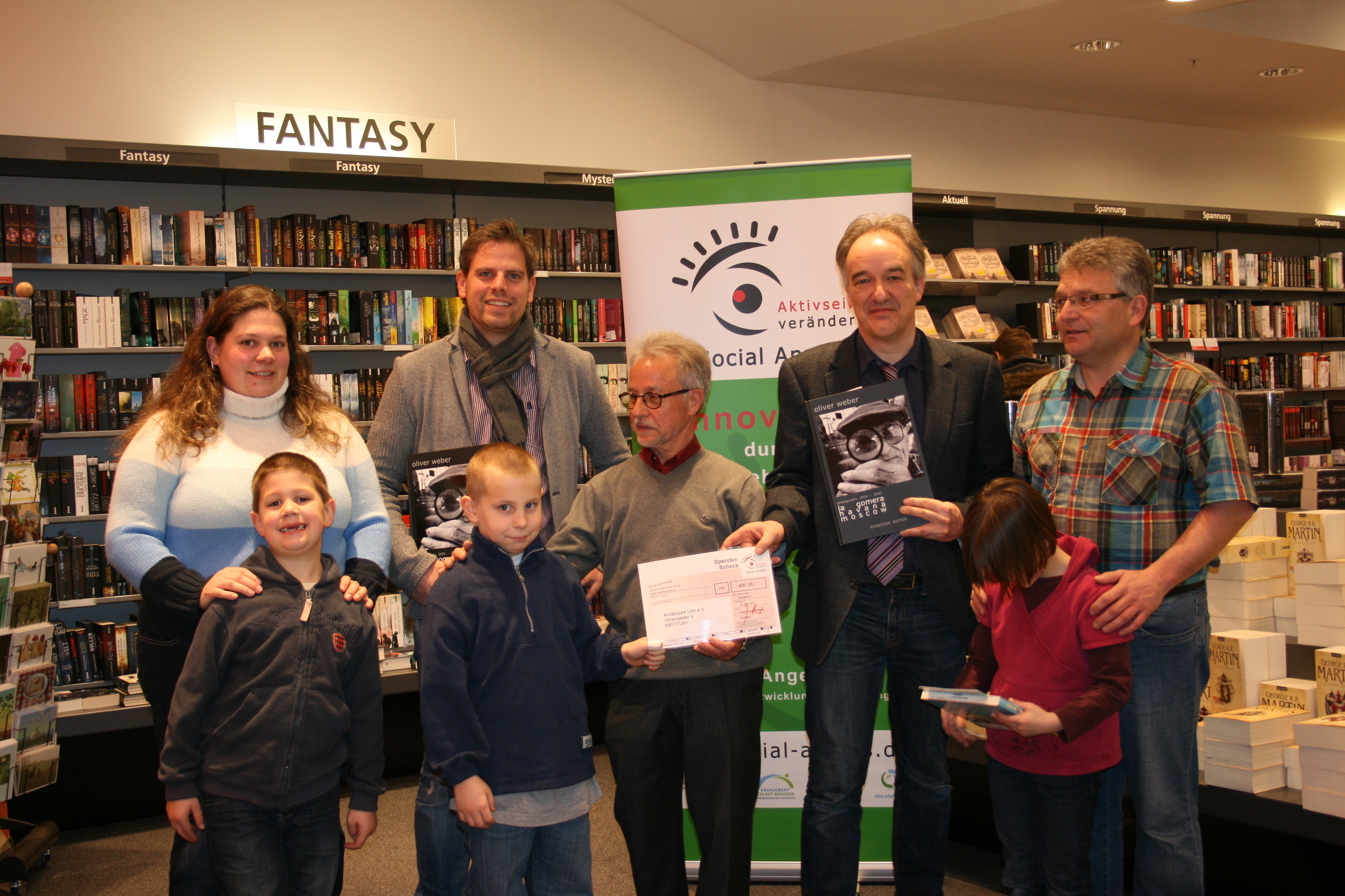Der bisher gesammelte Betrag beläuft sich auf 450,38 Euro, die dem Kinderpark Ulm zugutekommen. Der Vorstand des Kinderpark Ulm e. V (Henning Krone, Tina Börner und Jürgen Leicht), sowie zahlreiche Kinder des Kinderparks haben den Scheck von Kurt Freitäger (Projektleiter der Social Angels Stiftung) und Peter Kaiser (Geschäftsführer Buchhandlung Hugendubel) entgegen genommen.