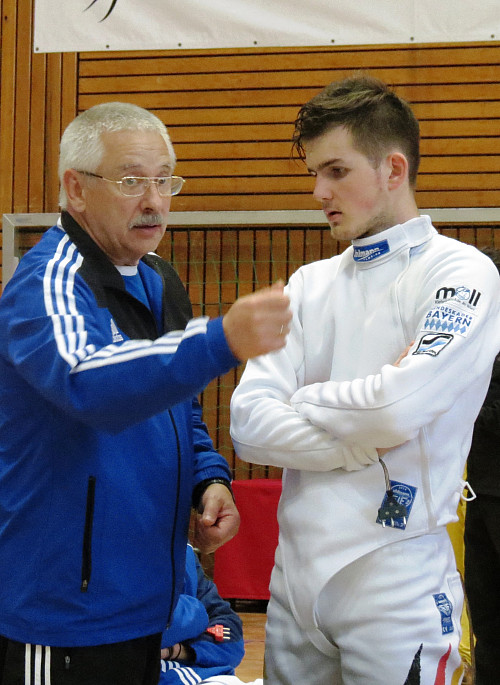 Beschreibung: Neu-Ulms Cheftrainer Ivan Taukachou bei der Analyse des Gefechts mit seinem Schützling David Stahl