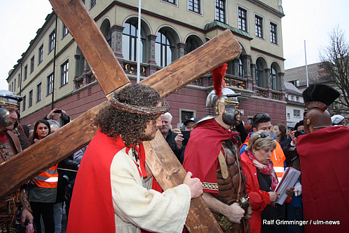 Mehrere tausend Zuschauer verfolgten an Karfreitag den Lebendigen Kreuzweg, der von rund 80 Laienschauspielern der italienisch-katholischen Gemeinde Ulm dargestellt wurde. Höhepunkt des dreistündigen Kreuzwegs war die bewegende Kreuzigungsszene auf dem Münsterplatz.