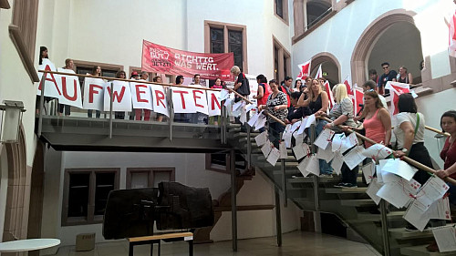 Dies haben Beschäftigte aus Ulmer KiTas am Dienstag im Rathaus der Stadt deutlich gemacht, als sie „ihrem“ Dienstherrn über 700 Unterschriften, die von Eltern gesammelt wurden, überbrachten. OB Ivo Gönner nahm, berichtet ver.di, „sichtlich genervt“ die Wäscheleine – an der die Unterschriftenlisten mit Wäscheklammern befestigt waren – entgegen.