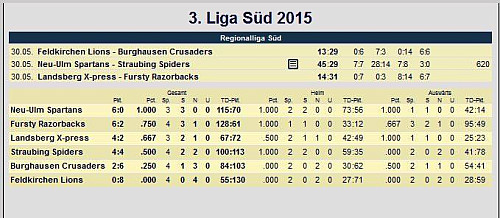 620 Zuschauer konnten, sofern sie Fans der Neu-Ulm Spartans sind, am Wochenende den dritten Sieg ihres Teams in der Regionalliga Süd bejubeln. Der Aufsteiger schlug im heimischen Dietrich-Lang-Stadion die Spiders aus Straubing mit 45 : 29 (7:7 / 28:14 / 7:8 / 3:0). Damit führen die Spartans weiterhin die Tabelle an.