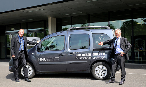 Die Hochschule Neu-Ulm und die Firma Wilhelm Mayer Nutzfahrzeuge GmbH & Co. KG verbindet seit der Gründung der Hochschule eine langjährige Zusammenarbeit. Ein Beispiel ist das erste Projekt im Praxissemester der Hochschule. Zwanzig Studierende erarbeiteten 1996 mit dem Unternehmen Einsatzmöglichkeiten der Telekommunikation im Außendienst. Heute beschäftigt das Unternehmen Wilhelm Mayer Nutzfahrzeuge GmbH & Co. KG mehrere Bachelor- und Masterabsolventen. Mit dem Sponsoring des Autos ist die Firma nun Logistikpartner der HNU.