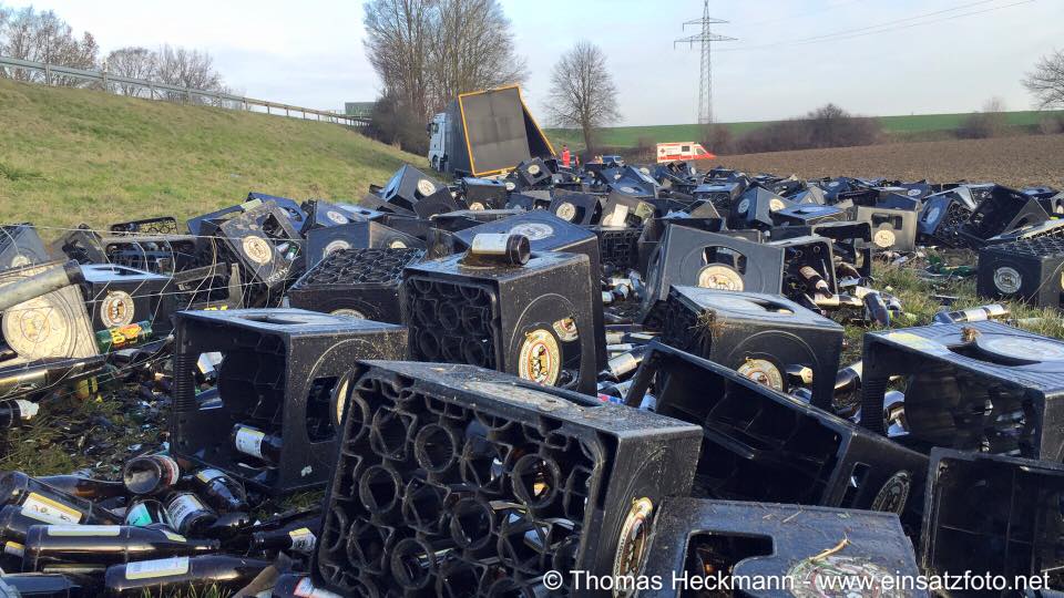 Sattelzug fährt die Böschung hinab - Leergut verstreut im Acker