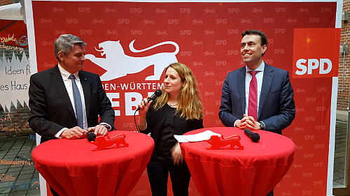 Beide Politiker appellierten an die Genossen, wie sie selbst auch, bis zum 13. März um jede Stimme für die SPD zu kämpfen, damit die „sehr erfolgreiche grün-rote Regierung fortgesetzt werden kann“.