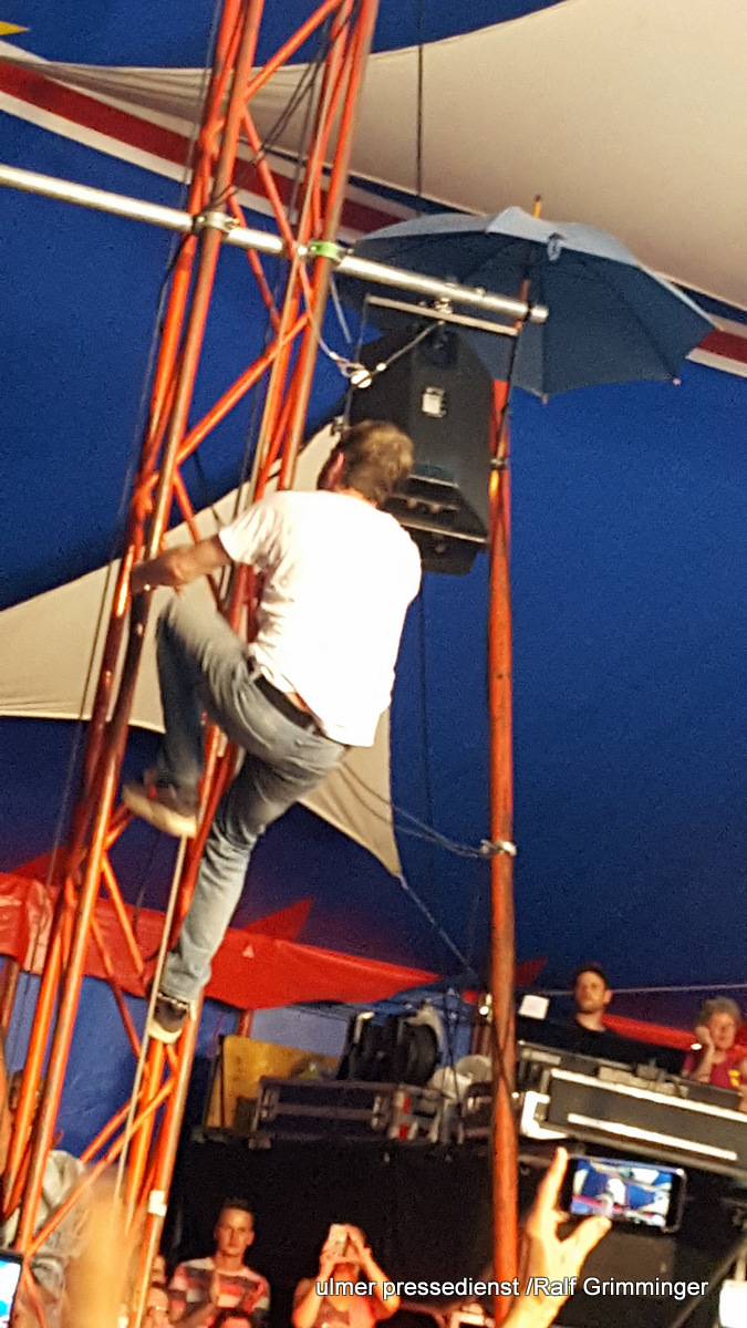Die Sportfreunde Stiller brachten am Mittwochabend die Fans im ausverkauften Ulmer Zelt mit einigen filigranen Fußballiedern gehörig ins Schwitzen. Das fußballverrückte Trio, das sich nach dem Trainer des SV Germering genannt hat und seit nun 20 Jahren erfolgreich zusammen auf der Bühne steht, spielte neben altbekannten Gassenhauern einige neue Songs des im Spätsommer erscheinenden sieben Albums, und natürlich kurz den WM-Hit "54,74, 90, 2010" an. "Wir haben schon WM-Hits geschrieben, da war Max Giesinger noch gar nicht geboren", merkte Sänger Peter Brugger dazu kurz an.  Da neben den gut 1000 Fans im Zelt noch etwa 2000 Besucher außerhalb des Zelts den lauen Sommerabend im Biergarten genossen, bescherte das Konzert der Stars aus Bayern dem Ulmer Zelt Rekordergebnisse. (Applaus, Applaus, dem schwer arbeitenden Gastroteam).