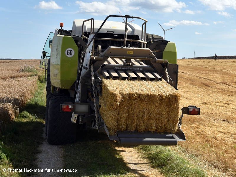 Östlich von Temmenhausen waren Landwirte mit dem Abernten von Getreidefeldern beschäftigt, als die Strohballen, die eine Ballenpresse fertigte, in Brand gerieten. Schnell brannte eine Ackerfläche von mehrenen Tausend Quadratmetern. Die Landwirte reagierten optimal, denn sie alarmierten nicht nur die Feuerwehr, sondern schafften auch drei große Jauchefässer heran. Rund 30 Feuerwehrleute aus Dornstadt, Tomerdingen und Temmenhausen löschten das brennende Stroh ab und gleichzeitig verteilten die Landwirte großzügig Jauche auf dem mittlerweile nur noch rauchenden Feld.
