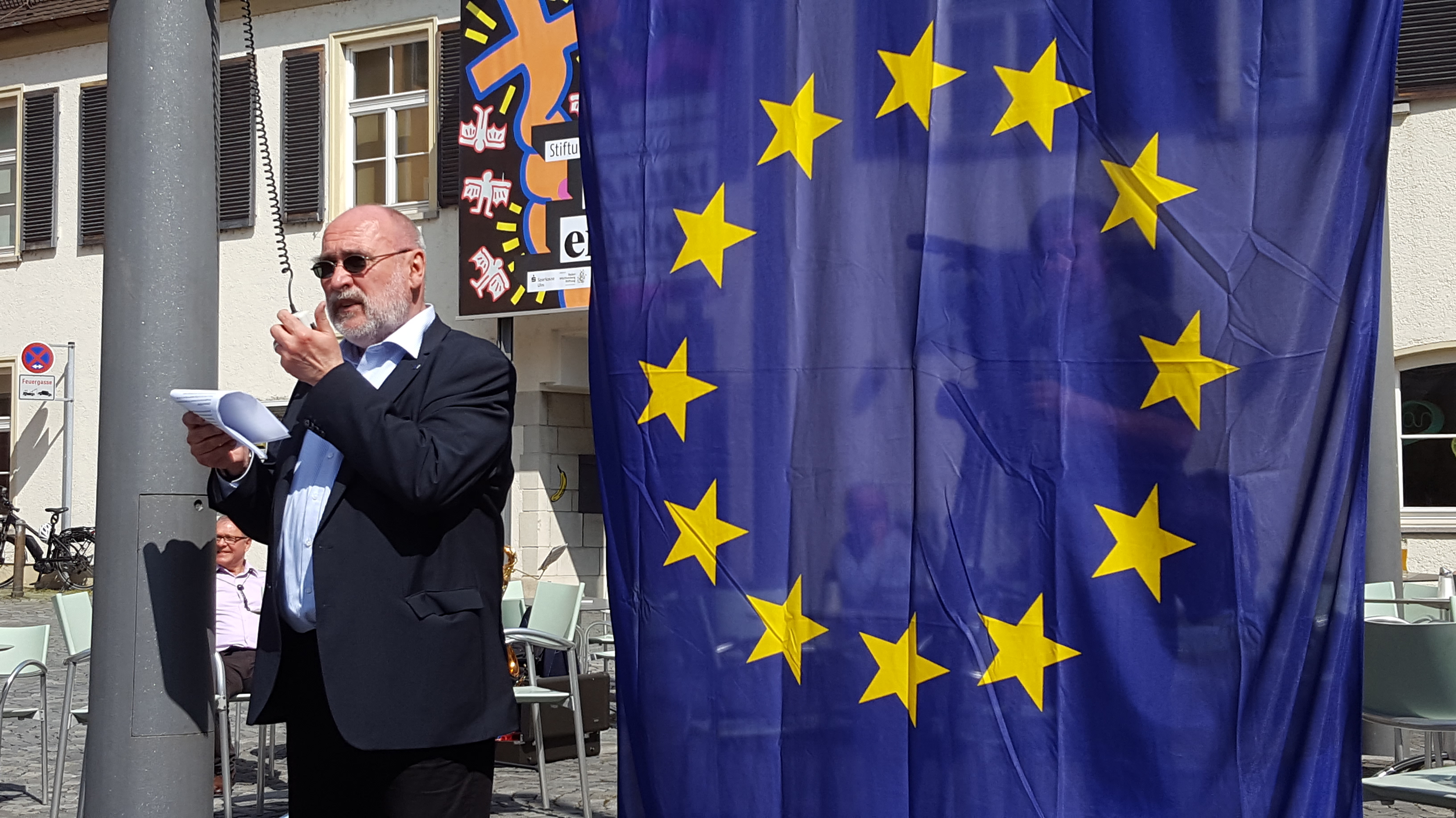 Beschreibung: Peter Langer spricht bei Kundgebung Pulse of Europe in Ulm und Neu-Ulm