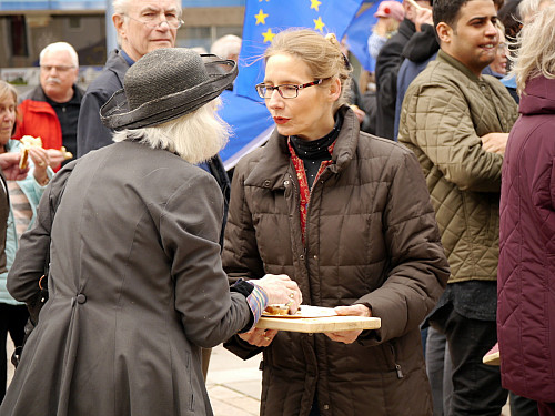 Die Kundgebungsteilnehmer hatten zuvor demonstrativ die Grenze zwischen zwei Ländern überwunden – durch den „Brückengang“ vom Ulmer Marktplatz über die Herdbrücke – und teilten auf dem Petrusplatz das Osterbrot miteinander, musikalisch unterhalten von Tommy Reichle und Michaela Reichle sowie der Ulmer Schauspielerin und Sängerin Carolin Gutting.