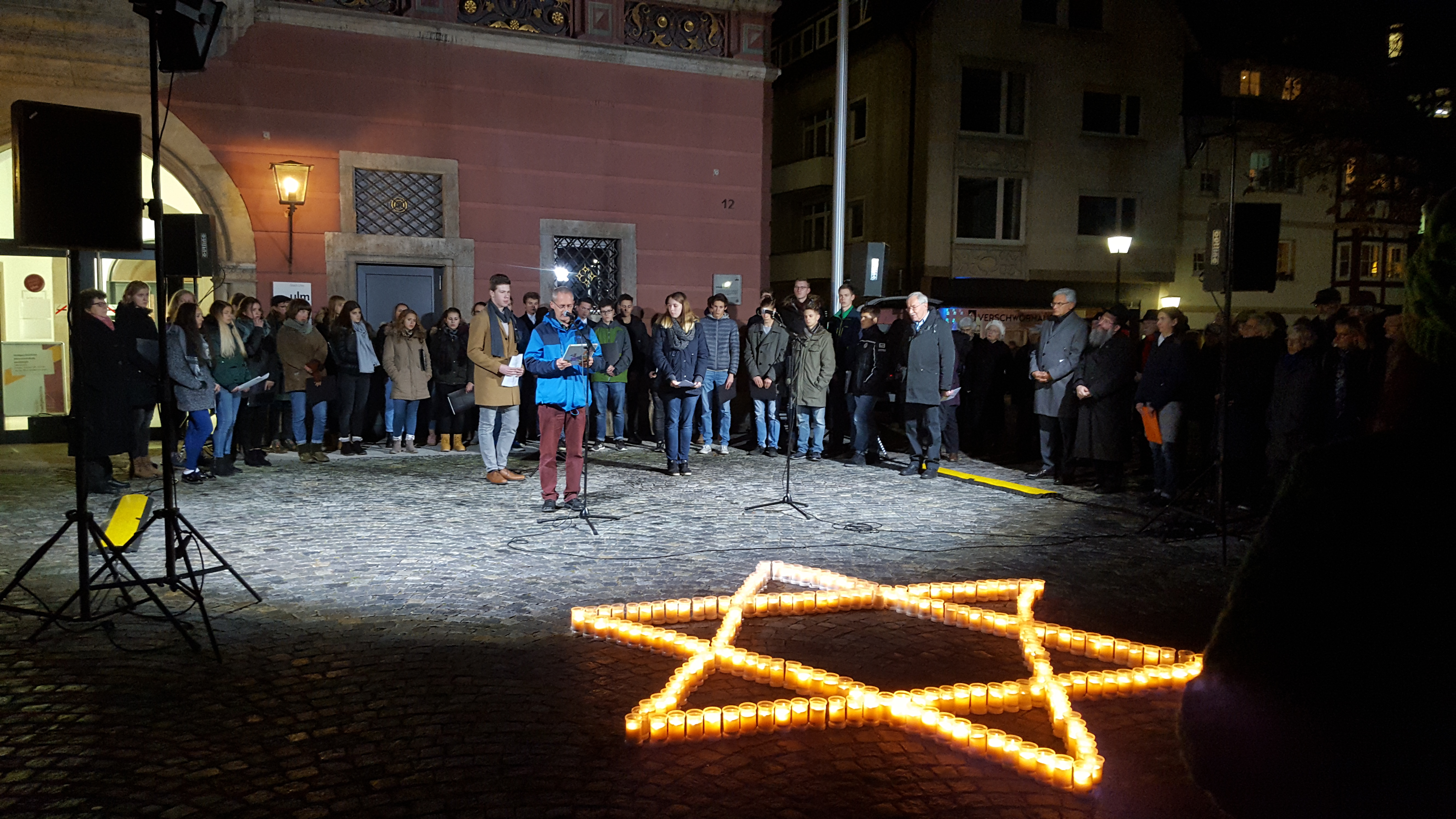 In der Nacht vom 9. auf den 10. November 1938 brannten überall in Deutschland die Synagogen. Oberbürgermeister Gunter Czisch erinnerte bei der Gedenkfeier zur Pogromnacht, die sich zum 79. Mal jährte, an die Zeit, "in der der Bürgersinn versagt hat", in der jüdische Geschäfte demoliert, jüdische Bürgerinnen und Bürger aus ihren Wohnungen geholt, öffentlich misshandelt und gedemütigt und später ermordet wurden. Zur eindrücklichen Gedenkfeier auf den Weinhof, dem Ort der früheren Synagoge, waren am Donnerstagabend gut 200 Ulmerinnen und Ulmer gekommen.