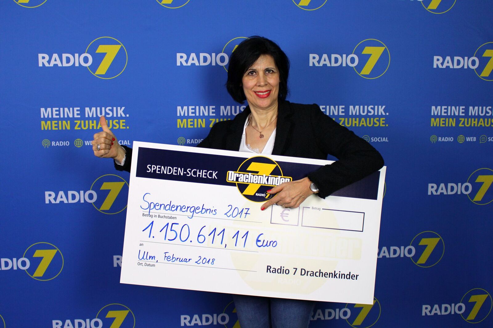 Beschreibung: Daumen hoch für die große Unterstützung: Ursula Schuhmacher, Leiterin der Radio 7 Drachenkinder, freut sich über den neuen Spendenrekord!