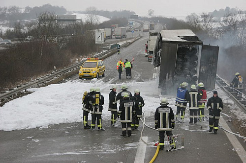Löschversuche des 41-jährigen Fahrers mit einem Feuerlöscher zeigten keinen Erfolg. Er konnte allerdings noch rechtzeitig die Zugmaschine abkoppeln und so ein Übergreifen der Flammen auf das Fahrerhaus verhindern. Der Auflieger, welcher vermutlich mit Metallrohren beladen war, brannte vollständig aus. Er muss mit einem Kran geborgen werden. Die Bergung dauerte mehrere Stunden. Im Bereich der Unfallstelle kam es seit dem Brand zu geringfügigen Verkehrsbehinderungen. Zeitweise betrug der Rückstauch rund einen Kilometer. Während der Bergungsmaßnahmen kam es auch kurzzeitig zu Sperrungen. Soweit möglich wurde der Verkehr an der Brandstelle vorbei geleitet. Der entstandene Sachschaden beläuft sich laut den ersten Schätzungen vor Ort auf über 50 000 Euro. Die Autobahnpolizei aus Günzburg hat die weiteren Ermittlungen vor Ort zur Brandursache aufgenommen. Bislang liegen keine Erkenntnisse über verletzte Personen vor.