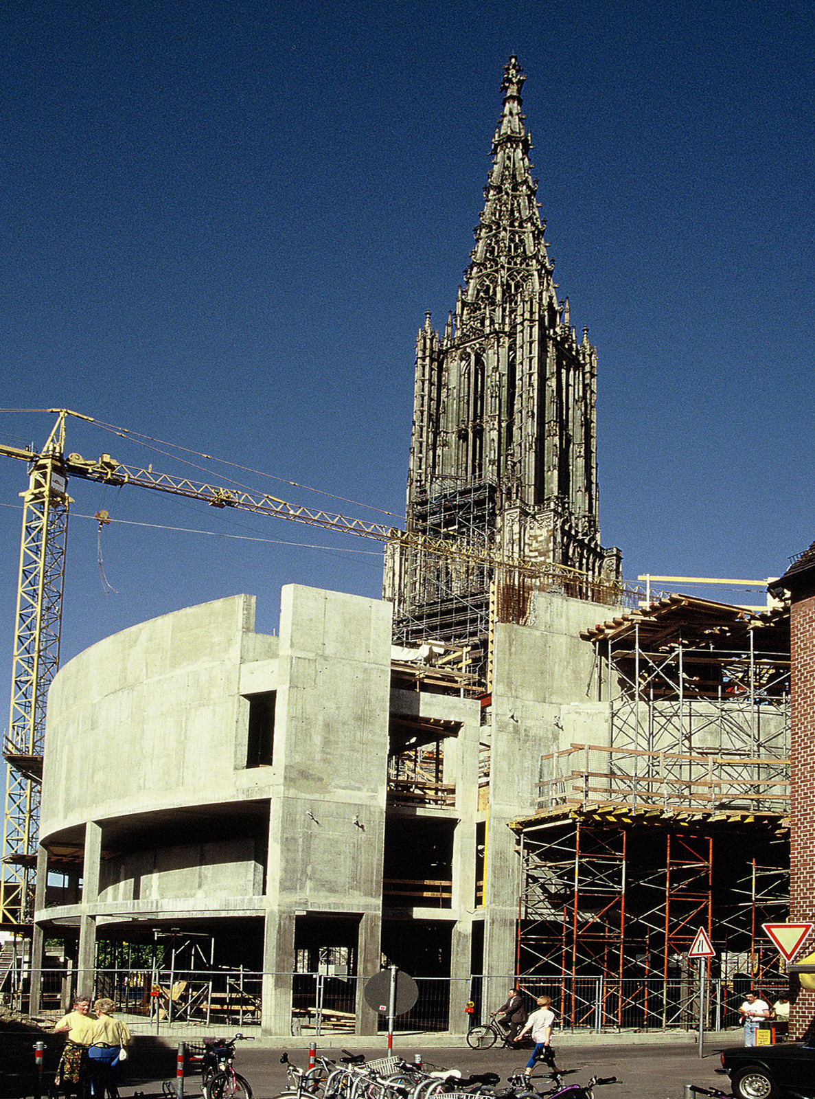 1987/88 begann in Ulm der Streit um den geplanten Richard Meier- Bau. Zur selben Zeit bezog Martin Rivoir 28-jährig seine erste eigene Wohnung - ausgerechnet am umstrittenen Ort des Geschehens, dem traditionsreichen Münsterplatz. Vom ersten Baggerstich am 8. Januar 1991 an konnte der Ulmer von seinem Fenster aus die komplette Bauzeit des Stadthauses hautnah miterleben. Mit dem Meier-Bau entstand etwas, das es in Ulm bisher nicht gegeben hatte. Martin Rivoir beschloss daher, regelmäßig, und zwar jeden Sonntagvormittag, mindestens ein Foto von der Baustelle zu machen. Er zog den Plan konsequent durch, nummerierte und archivierte im Laufe der Monate weit über 600 Dias, bis zum Tag seines Auszugs, dem 31. Mai 1993. Ein halbes Jahr später wurde das Stadthaus eröffnet.