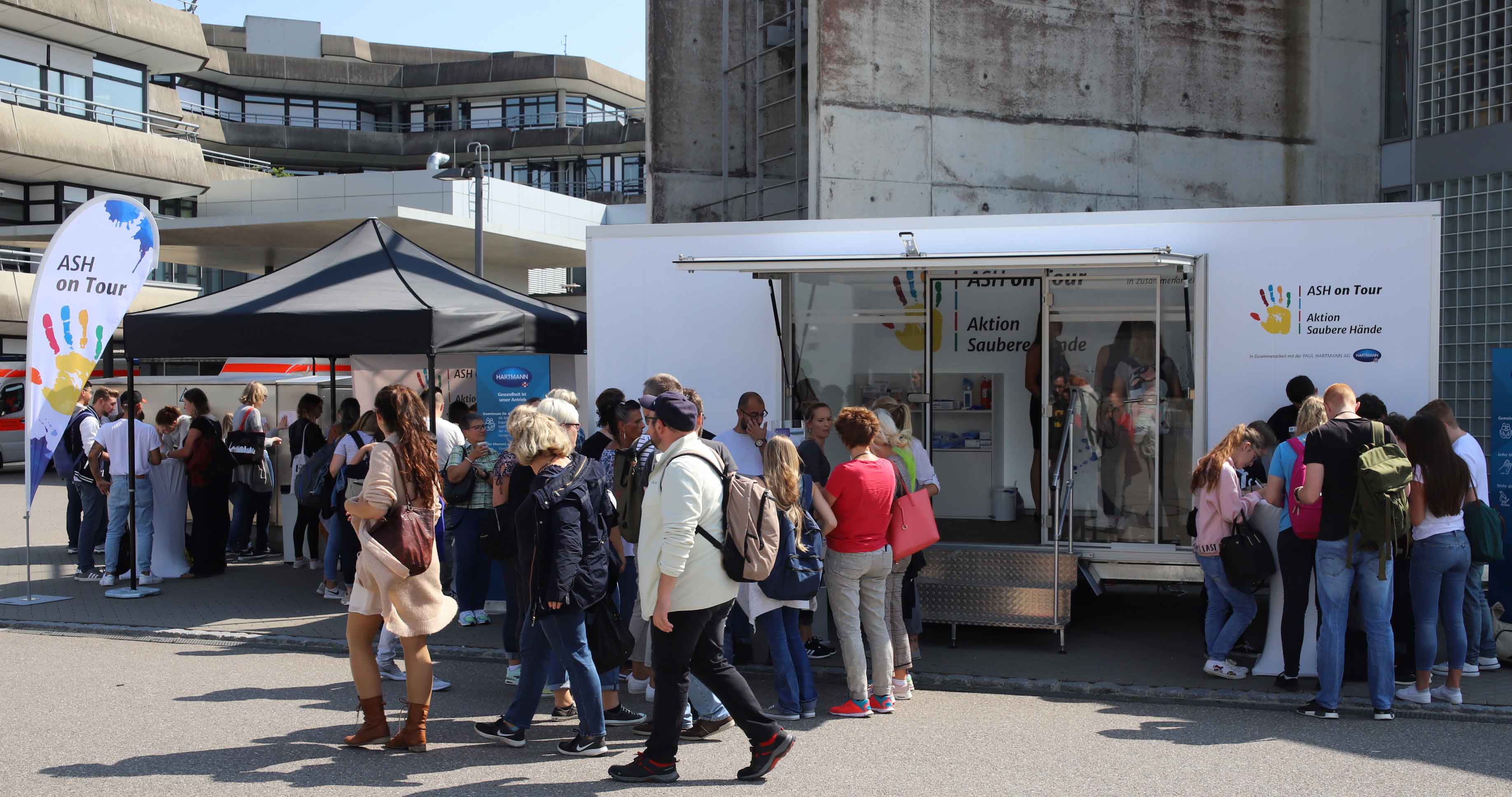Alle Mitarbeiterinnen und Mitarbeiter des Klinikums aber auch umliegender medizinischer Versorgungszentren, Arztpraxen und Pflegeeinrichtungen waren eingeladen, den ganzen Tag lang verschiedene ASH-Lernstationen auszuprobieren. Bei strahlendem Sonnenschein nahmen viele Interessierte das Angebot wahr und besuchten das „ASH-Mobil“, um ihr Wissen rund um das Thema Händehygiene zu testen und zu erweitern. Neben den Lernstationen bot das Team der ASH zusätzlich einen ganztägigen Workshop für alle Hygienebeauftragten des Klinikums an. UKU-Mitarbeiter*innen, die nicht am Oberen Eselsberg, sondern an den Standorten Michels- oder Safranberg arbeiten, konnten den eigens angemieteten „Hygiene-Express“ zum „ASH-Mobil“ nutzen. „Wir freuen uns sehr, dass so viele Kolleginnen und Kollegen mitgemacht haben“, betont Professorin Heike von Baum, die am Universitätsklinikum Ulm die Sektion Krankenhaushygiene leitet. „Der Aktionstag bot allen Beschäftigten eine exzellente Möglichkeit, ihr Wissen um die Händehygiene zu prüfen und zu vertiefen. Unter dem Motto ‚Wir handeln‘ haben wir gemeinsam gelernt, diskutiert und uns gegenseitig motiviert.“