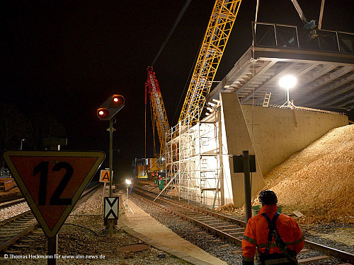 Seit Monaten wird direkt am Haltepunkt Ulm-Donautal der Bahnstrecke Ulm-Friedrichshafen gearbeitet. Im September wurde die alte Brücke der Benzstraße abgerissen und dann Fundamente für eine neue Brücke gebaut. Neben dieser Baustelle haben Stahlbauer die Straßenbrücke fertiggestellt, die in der Nacht zu Sonntag durch einen Kran eingesetzt wurde. Dadurch konnte eine wochenlange Sperrung der Bahnlinie vermieden werden, die notwendig geworden wäre, wenn man eine konventionelle Spannbetonbrücke mit einem Traggerüst und einer Verschalung gegossen hätte. Die neue Brücke liegt etwa 35 Zentimeter höher als die langsam sanierungsbedürftige alte Straßenbrücke und schafft außerdem Platz für den Fahrdraht der Bahnlinie, die derzeit elektrifiziert wird. Gegen 23 Uhr sind die Seile des Krans an der neuen Brücke befestigt und scheinbar mühelos hebt sich die Brücke von ihren Auflagen. Scheinwerfer erleuchten das Szenario taghell, denn Dutzende Bauarbeiter sind damit beschäftigt, ihre Arbeit zu vollenden. Der Raupenkran fährt vorsichtig vorwärts. Aus Holzbohlen, die größer als Eisenbahnschwellen sind, wurde ein Weg hin zur Benzstraße gebaut. Die 200 Tonnen Gegengewichte werden immer wieder in der Höhe nachjustiert, um die neue Stahlbrücke anheben zu können. Ein V-förmiger Ausleger über dem Raupenfahrweg ragt über 80 Meter in den Nachthimmel. Nach wenigen Minuten Fahrt schwebt die neue Brücke neben den Bahngleisen und dann ist erst einmal warten angesagt. Noch drei Züge müssen die Baustelle passieren, während an jeder Ecke der Brücke ein langes Seil zum Boden führt und jeweils ein Arbeiter ein Drehen der Brücke über ihren Köpfen verhindert. Es wird null Uhr, bis der letzte Zug leicht verspätet an der Baustelle vorbeifährt. Nun haben die Bauarbeiter wenige Stunden Zeit, die Brücke einzusetzen und zu befestigen. Am Sonntagmorgen läuft dann der Zugverkehr unter der neuen Brücke hindurch. Mehrere Monaten Vorplanung waren notwendig, um den Kraneinsatz zu planen. Über elf Meter sind die beiden Kettenfahrwerke lang und ziemlich genau zehn Meter breit ist der Kran, der bis zu 800 Tonnen Last heben und auch fahren kann. Damit der Kran im Ulmer Donautal aufgebaut werden konnte, waren 35 Lastwagen notwendig, um alle Einzelteile und Gegengewichte zur Baustelle zu bringen. Drei Tage lang waren Arbeiter damit beschäftigt, den Kran zusammenzubauen und betriebsbereit zu machen und es wird weitere drei Tage benötigen, um ihn auch wieder abzubauen. Kräne dieser Größenordnung werden normalerweise in ganz Europa eingesetzt und sind dann monatelang in Windparks bei der Arbeit, um Windräder zu montieren. Mit allen Ausbaustufen des Kranauslegers lässt sich der Ulmer Kran bis auf 190 Meter verlängern und könnte damit problemlos Arbeiten an der Spitze des Ulmer Münsters verrichten. Die Anpassungen der Bundesstraße 311 an die neue Brücke der Benzstraße erfordern eine Vollsperrung der B311 vom 26. April bis zum 6. Mai, dann werden im 24-Stunden-Betrrieb Arbeiten erledigt, die auf einer normalen Baustelle ein halbes Jahr benötigen würden. Die Eröffnung der Benzstraße ist für den Oktober geplant, bis dahin bleibt die provisorische Brücke für Fußgänger und Radfahrer in Betrieb.