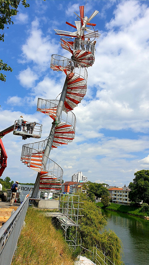Geschafft! Die Mitarbeiter der Firma „Saage Treppenbau & Biegetechnik“ aus Nordrhein-Westfalen und die Baufirma Fromm aus Grimmelfingen setzten am Mitwoch die letzten Teile des Berblinger Denkmals an der Adlerbastei in Ulm zusammen. Das eindrucksvolle Denkmal wurde von den Münchner Künstlern Johannes Brunner und Raimund Ritz gestaltet. Gegen 15 Uhr bestiegen Vertreter der Stadt Ulm, unter ihnen Baubürgermeister Tim von Winning und Kulturbürgermeisterin Iris Mann, erstmals das Denkmal, das sich absichtlich und bedenklich 10 Grad über das Donauufer neigt. Die Einweihung des schiefen Turms von Ulm, der das Zeug zu einem weiteren Wahrzeichen der Münsterstadt hat und von dem man einen eindrucksvollen Blick hat, ist für den 25. Juni vorgesehen, einen Tag nach Berblingers 250. Geburtstag. Weitere Fotos gibt es hier.