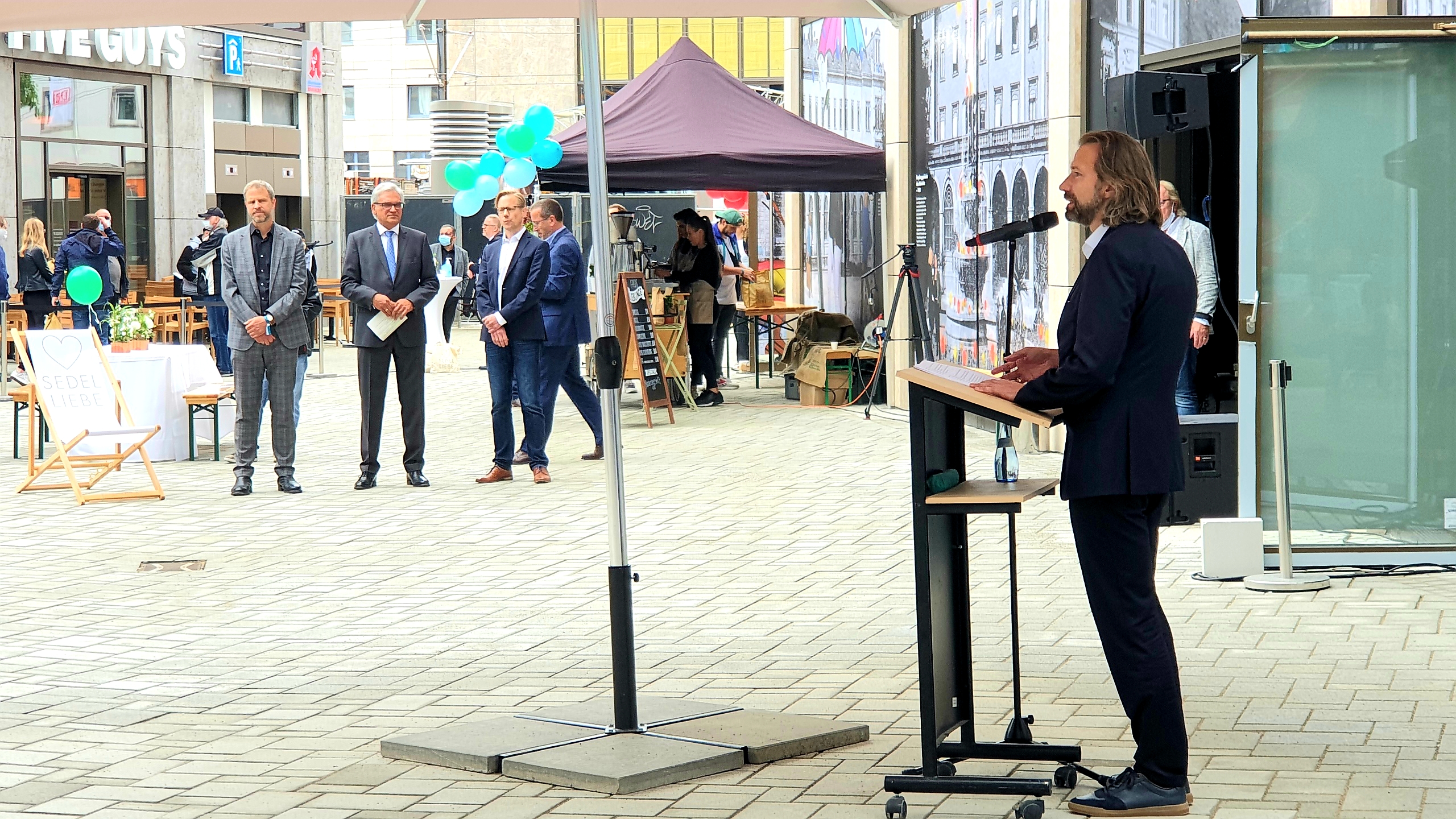 Wo einst das Geburtshaus von Ulms berühmtesten Sohn stand, rahmen nun fünf Gebäude den rund 2.000 m² großen Albert-Einstein-Platz, der auch den Bahnhof mit der Altstadt verbindet. „Ich freue mich, dass wir die Sedelhöfe heute gemeinsam eröffnen. Die ersten Geschäfte sind seit heute offen, und auch die Büros und Wohnungen werden nun nach und nach bezogen. Jetzt ist es an uns, diesen neuen Teil der Innenstadt mit Leben zu füllen. Auch wenn wir uns sicherlich alle andere Rahmenbedingungen für den Start der Sedelhöfe gewünscht hätten: Ich bin überzeugt, dass das, was hier entstanden ist, so stark und überzeugend ist, dass es sehr schnell fester und selbstverständlicher Teil der Ulmer City sein wird“, sagte Gunter Czisch, Oberbürgermeister von Ulm. Mit der Eröffnung feierte auch die Open-Air Kunstgalerie „Sedel Gallery“ Vernissage: Als Gemeinschaftsprojekt von und für Ulm zelebriert die Ausstellung eine Symbiose aus Historie und Moderne und zeigt Aufnahmen aus dem letzten Jahrhundert, die bisher der Öffentlichkeit nicht zugänglich waren. Erstmals hatten Ulmer heute die Gelegenheit, das Quartier als neuen Teil ihrer Stadt zu erleben. Die Einzelhändler haben geöffnet, die Büro- und Wohnungseinheiten werden aktuell final ausgebaut.