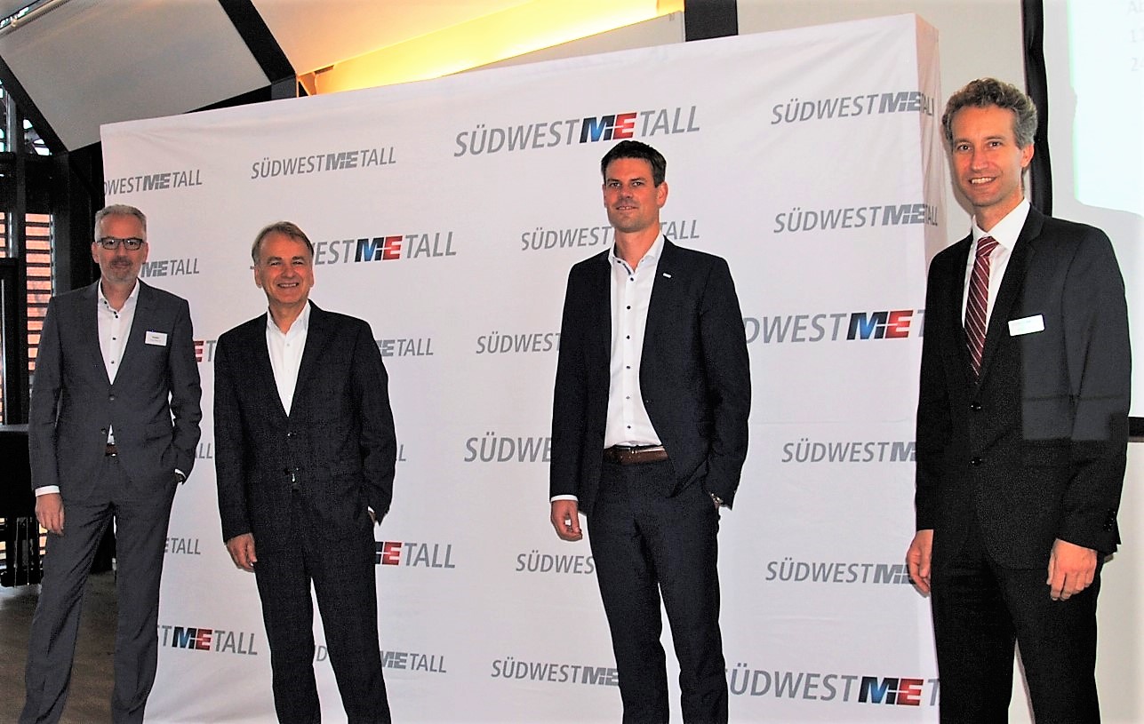 Beschreibung: Peter Fieser, neuer Vorsitzender der Südwestmetall Bezirksgruppe Ulm (zweiter von links) umgeben von seinen beiden Stellvertretern Stefan Halder (links außen) und Oliver Wirth (dritter von links) und Götz Maier, Geschäftsführer d