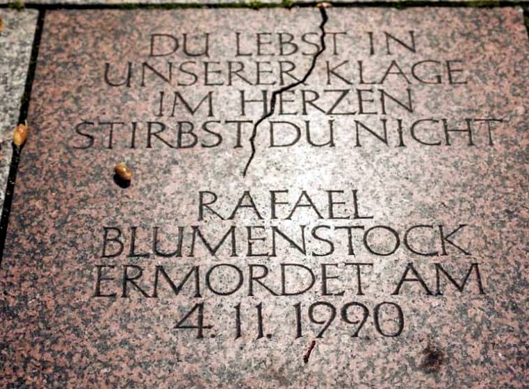 Beschreibung: Die Gedenktafel vor dem ehemaligen Haushaltswarengeschäft Abt erinnert an den Mord an Rafael Blumenstock vor 30 Jahren.