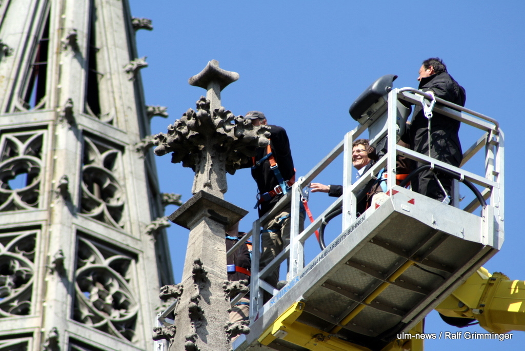 Mit einer großen Hebebühne haben Fachleute die Baussubstanz am Ulmer Münster begutachtet und auch dokumentiert. Mit an "Bord" war auch der Hausherr, Münsterdekan Ernst-Wilhelm Gohl sowie Münsterbaumeisterin Dr.-Ing. Ingrid Helm-Rommel..