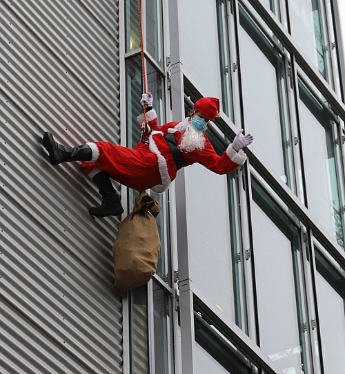 Nikolaus seilt sich vom Klinik-Dach ab