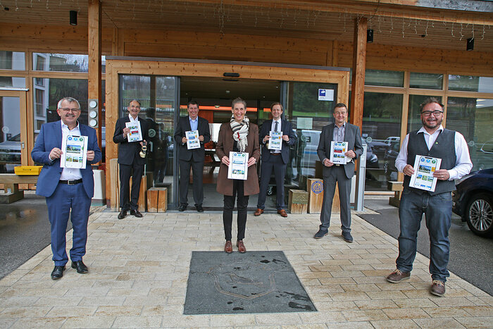 Beschreibung: (v.l.) Bürgermeister Andi Haid, Kleinwalsertal; Carl Nägele und Andreas Fischer, GF Thepeople GmbH (Umsetzung der Nativen App) Frau Landrätin Indra Baier-Müller, Landkreis Oberallgäu; Jörn Struck, GF der Wilken Software G